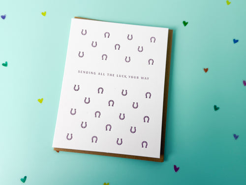 This charming card is sprinkled with petite, purple horseshoes, each one playfully arranged like a constellation of good fortune. The soft, repeating, letter pressed motifs feel thoughtful and intentional, turning a classic symbol of luck into something modern and artful. We love the indention of the press in each tiny detail of the horseshoes. Paired with a warm, well-wishing sentiment, it feels like a small but meaningful gesture meant to spur someone on towards their next great achievement. A quiet reminder that a little luck can always be sent, sealed, and shared. Lickety Split Press creates modern, uncommon and delightful paper products for good natured people. Their letterpress product line is designed and hand-printed in our studio on vintage presses from the 1910s-1960s by a small but growing team of creatives.