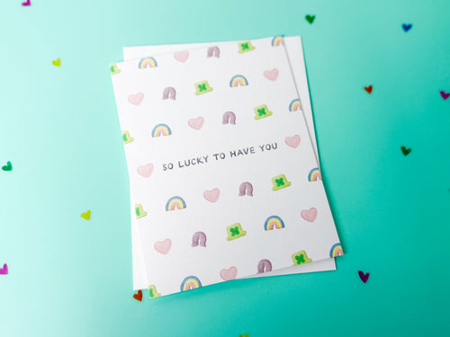 This sweet card is a lucky charm in paper form—scattered with soft watercolor icons like rainbows, hearts, horseshoes, and clover-topped hats. The playful pattern feels light, whimsical, and just nostalgic enough to make you smile. Centered in the middle is the simple message “So Lucky to Have You,” making it perfect for thanking a friend, celebrating love, or sending a little everyday magic. It’s a cheerful reminder that the best kind of luck is the people you get to keep. Amy Zhang creates fun, punny greeting cards to celebrate the little moments in your life! Meet AMY ZHANG, a pretty, witty, and punny greeting card brand. They are proudly female-founded and family-operated.