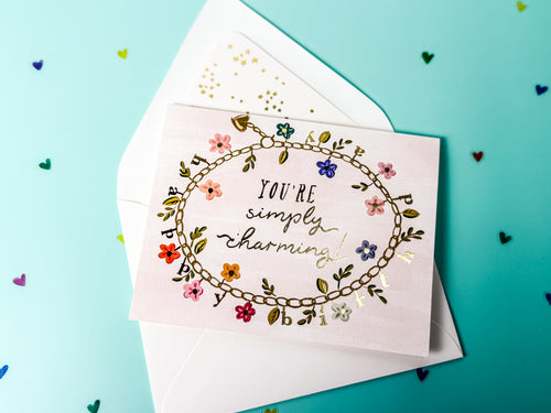 This delightful card feels like a love letter to small, beautiful details. A painted charm-bracelet wreath loops together dainty florals, tiny charms, and golden accents, framing a birthday message letting someone know just how charming they are! The hand-illustrated style gives it a keepsake quality, as if each charm was chosen with care. Perfect for letting someone know just how special they truly are on their special day. The First Snow hails from Oklahoma City and is committed to delivering timeless magic, unwavering quality, and enduring charm in their premium stationery line.