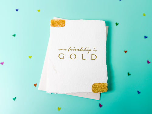 Featuring deckled edges and delicate gold accents brushed into the corners, this card feels like a modern keepsake plucked from a treasure box. The warm metallic lettering — “Your Friendship is Gold” — reminds someone that their friendship is a gold to you! A little shimmer, a whole lot of heart. Paper Baristas love textures, letter pressing, sustainability, coffee and people. Each paper is made from upcycled cotton rags that were going to be tossed out by the garment industry, and Paper Baristas is also actively fighting to end human trafficking around the world with every purchase of a Paper Baristas card.