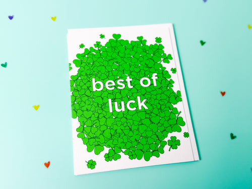 This cheerful card bursts with a lively cluster of letterpressed clovers, layered together like a little field of good fortune. The bold, graphic illustration feels playful and confident, letting the simple “best of luck” message shine at the center. It’s the kind of design that feels instantly encouraging — bright, optimistic, and full of charm. A joyful way to send a lucky thought when it matters most. Kate Murray, owner, printer and designer at Quick Brown Fox, is one of the warmest, funniest people you will encounter. She has a love for people, paper, and making a day brighter with the perfect pun. She hails from Saugerties, New York and started in the business by working in letterpress studios for a decade prior to launching her fantastic brand of letterpress cards. Her cards are quirky, bright, and filled with the best puns!