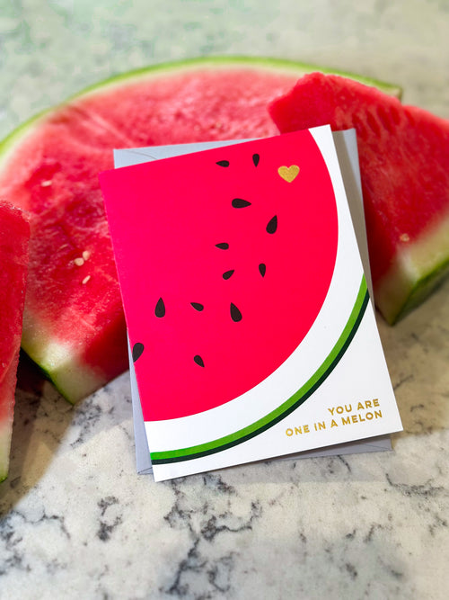 Tell someone they are “One in a Melon” with this gorgeous slice of watermelon by Fine Moments! The color is exquisite, and the gold foil pressed heart adds the perfect detail! Fine Moments is a husband-and-wife led greeting card company that was founded by Jason and Hae Carberry in 2005. Their line of greeting cards is crisp, modern, often humorous, and appeals equally to both men and women alike. Fine Moments recently partnered with One Tree Planted, giving a portion of their proceeds from every order placed, to support global reforestation. For every dollar donated, one tree is planted.