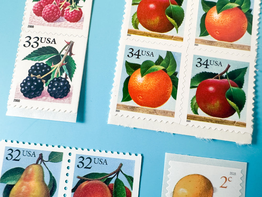 Card 5 - For your final card, use the 1995 peach and pear set, with a current 2 cent Meyer Lemon Stamp. These fresh fruits will brighten any postal missive!