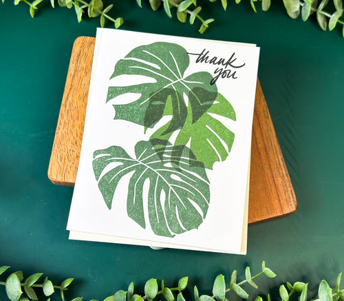 Say thank you with this hand carved linoleum block creation of monstera leaves. We love the overlapping design, various shades of green, and hand lettered message letterpressed into the card face. Lynn-oleum creator and owner Lynn Jones strongly believes in empowering women, preserving nature, supporting small businesses and encouraging creativity. We have been a huge fan of her Linoleum block printmaking line for a long time and even bigger fans of her personally! We are so excited for her debut in a Postmark’d Studio parcel.