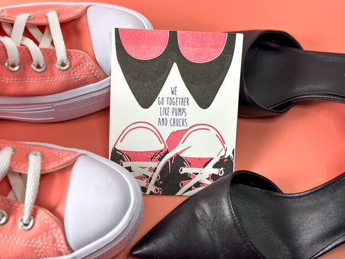 We love the bright pink of this card and the letterpress detail on these lace up chucks! Allison (pumps) and Kate (chucks) are a pumps and chucks kind of pair, and we hope you’re other half will delight in this card as much as we do! We love creative Bill Muller at Big Wheel Press and his quirky and vintage designs!