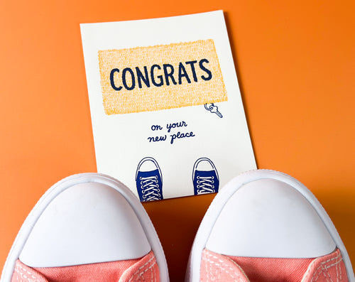 Send someone a congratulations card to welcome them to their new home! We love the letterpress details on the welcome mat, the key sneaking out from under the mat, and of course, the sneakers! This is a great card to have on hand to celebrate the milestone of a new home with someone! Smudge Ink is a small team that loves snail mail, letterpress, and playful design. They are American made, woman-owned, and eco-conscious.