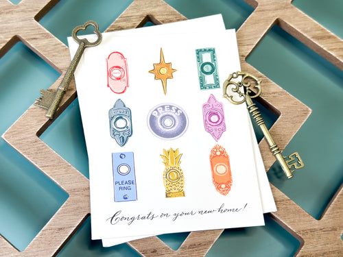 Welcome the new chapter with this cheerful greeting card from Antiquaria, featuring nine unique and charming doorbells, each one ready to ring in a fresh start. With the message “Congrats on your new home,” this card is a delightful way to celebrate the exciting milestone of settling into a new space. Perfect for housewarmings, new beginnings, or just sending a bit of joy to those embarking on their next adventure. Antiquaria desires to create products and designs that are not only beautiful but inspire slowing down, living intentionally, and taking notice of the magic in every day.
