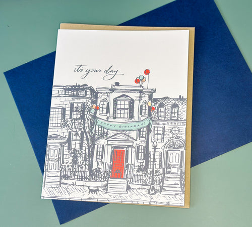 Step into the city vibe with this striking print of a classic brownstone walk-up, drenched in calming blues with one bold red door standing out. Bringing color, joy, and a touch of street-style flair to celebrate someone’s special day. This card by 2021 Co. combines artistic charm with urban cool, making it the perfect fit for anyone who loves the city, creativity, or a birthday celebration with a little extra edge. Established in 2018, 2021 Co. is a stationery company created by best friends, Emily King + Nicole Couto. Together they collaborate to make one-of-a-kind encouraging, uplifting (and fun!) greeting cards with the mission of making the world a little better place, one card at a time. They cheer others on with wild abandon, and we love their encouraging hearts!