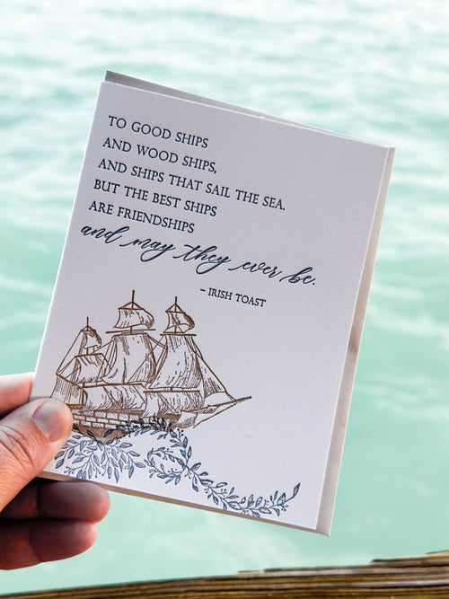 An Irish toast beautifully rendered by Rust Belt Paperie; this card makes a wonderful hostess gift with your favorite bottle of bubbly or as a stand alone snail mail missive! Kate's favorite card in the set, this toast is one that has graced her dining room many times over. Rust Belt Love has captured it brilliantly. Rust Belt Love is a stationery and gift company who focuses on connecting people with beautiful messages with nature-inspired letterpress greeting cards and gifts. Based in Buffalo, NY in the heart of the Rust Belt, owners Alyson and Nick believe that what people need now more than ever is real human connection. Their heart-centered letterpress stationery is for paper lovers who want to send heartfelt messages with a thoughtful, handmade look and feel. Alyson is a classically trained illustrator who does all of the drawing and designing, and Nick does all of the printing, often on their 100 year old letterpresses. Alyson and Nick are two of the kindest people you will ever meet, and we are so thankful to call them paper friends!