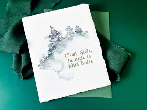 Watercolor, letterpress, and french text, “It is Christmas the Most Beautiful Night,” bring to mind the silence of a Christmas night. This awe inspiring card by Paper Baristas will stunningly wish your loved ones a happy holidays. Paper Baristas love textures, letter pressing, sustainability, coffee and people. Each paper is made from upcycled cotton rags that were going to be tossed out by the garment industry, and Paper Baristas is also actively fighting to end human trafficking around the world with every purchase of a Paper Baristas card.