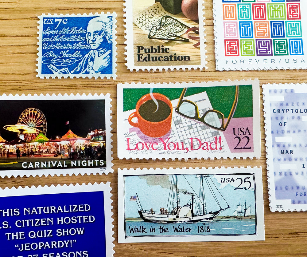 Card 5: Two 22 cent stamps + public education + Benjamin Franklin -