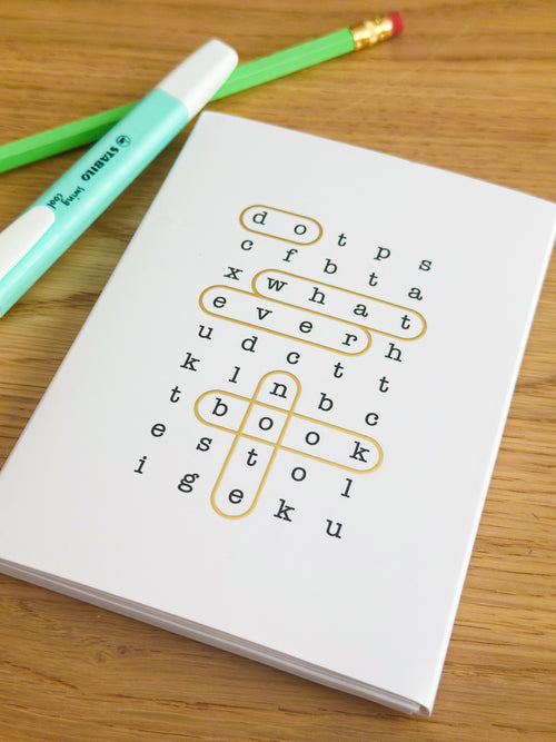 Start your year off right with this perfect pocket sized, gold foil notebook with a gold foil word search cover! We love the grid pages, spiral binding, the envelope flap pocket cover, and all the details that make this such a fun little notebook to have on hand. Fine Moments is a husband-and-wife led greeting card company that was founded by Jason and Hae Carberry in 2005. Their line of greeting cards is crisp, modern and often humorous. Jason and Hae are some of the kindest in the stationery world, and we love to share their art with you!
