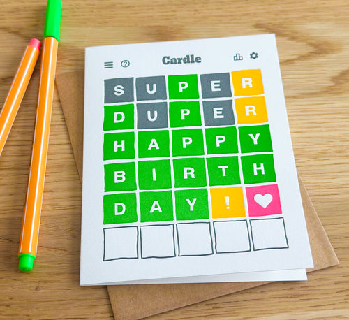 Send a Cardle birthday greeting to your favorite Wordle aficionado with this colorful, letterpress card from Sweet Bippy Press. Great for any birthday, this card is sure to usher in a birthday celebration! Sweet Bippy began creating greeting cards in 2018 when Patricia, who had long harbored the desire to start a greeting card company, met Michael, a designer with a printing press. Sweet Bippy was born, and they have been busy making letterpress creations ever since!