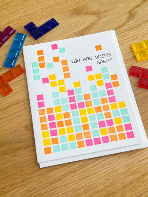 The perfect card to send for encouragement or just because, we love the neon Tetris blocks on this letterpress card from Ilee. Ilee Papergoods is a boutique letterpress company based in Seattle. All of their products are printed by hand on recycled materials.