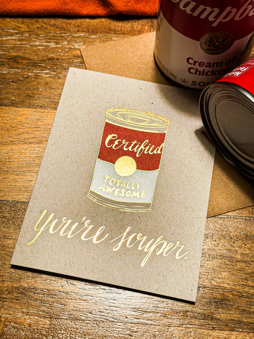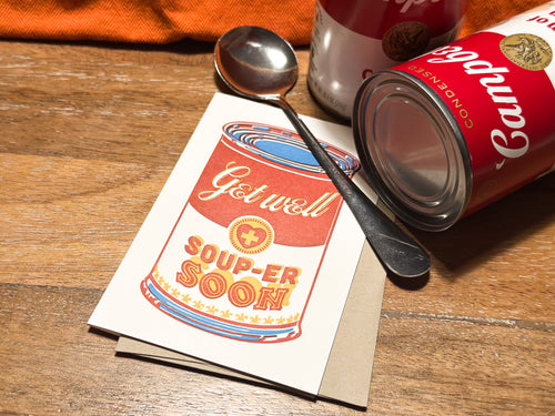 Grab this can of soup the next time someone is sick and send a ray of sunshine! What’s not to love on this card with its letterpress detail from Pike Street Press? It whimsically depicts a can of soup with a vintage flair! Pike Street Press designs and crafts artisan greetings in the Pacific Northwest. The tradition and love of letterpress printing is ingrained in everything they do.