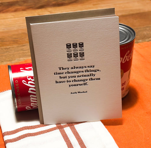 This black and white depiction of Andy Warhol’s soup art accompanied with his wise words about our ability to impact the world for good, is the perfect encouragement for a world changer in your life! Andy Warhol’s art is iconic and the letterpress relief reproduced by Bill Muller of Big Wheel Press in stark black and white makes this a framable card! Big Wheel Press was founded by Bill Muller in 2006. Its name comes from the first press Bill owned - a Pearl #14 with a large cast iron flywheel. Big Wheel Press continues to use traditional letterpress techniques to craft quirky cards with a vintage flair. Bill is one of the coolest guys in the stationery creation business, and has an eye for art in all that he creates!