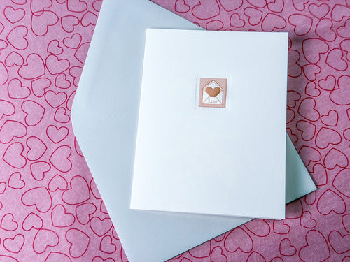 This delightful greeting card brings vintage charm to every heartfelt message, featuring a beautiful love postage-stamp design letter press printed on cotton paper. Its blank interior invites cozy, personal notes — perfect for sealing your love with words this Valentine’s Day or any day. A timeless piece that turns thoughtful sentiments into keepsakes. Belle and Union greeting cards are works of art, printed on antique printing presses in owner and creator Meg’s San Antonio retail store.