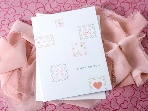 This whimsical Valentine’s card playfully pairs postage-stamp–inspired art with a punny “Stuck on You” message, capturing that sweet feeling of being utterly smitten. It looks and feels like a little piece of mail made just for your special someone, perfect for adding a heartfelt note that sticks with them long after the envelope is opened. Line & Kind Paper Co. is operated by creator Katie, a former ballet dancer and free lance designer who launched her own greeting card line in 2019 to combine her loves of the emotion of ballet, the aesthetic of design, and her love of meaningful connection.