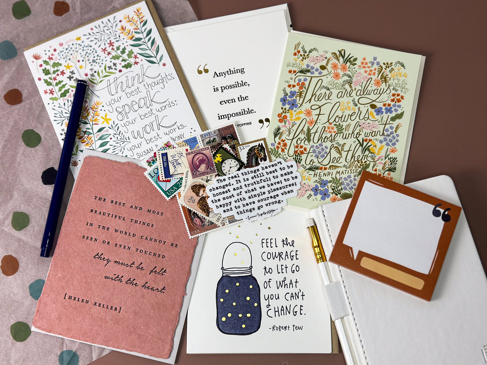Happy August, Posties! Letter writers like us have a love of words and so we are excited to share this month’s parcel with you, Words of Wisdom! We hope this parcel provides uplifting encouragement to you and your letter recipients and that the beauty of the cards magnifies the sentiments. This parcel is packed with all occassion, encouraging words to share with those you love. Spread the gift of connection through snail mail this month!