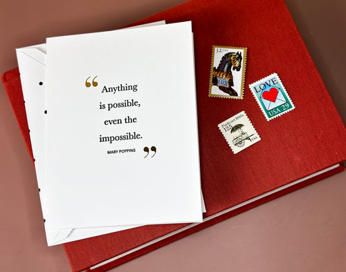 Letterpressed and gold foiled, this Sugar Paper card is sophisticated, glamorous, and perfect to send to anyone! Remind someone their impossible dream is possible with these hopeful words from Mary Poppins! In 2003, the ladies of Sugar Paper started tinkering with a letterpress and helping friends put beautiful paper in the mail. As each bespoke piece was sent, more and more people inquired. At a time when the world was steadfastly headed online, they took a risk and stayed focused on building a business offline, making beautiful, tangible things by hand that would far outweigh anything in the digital space.