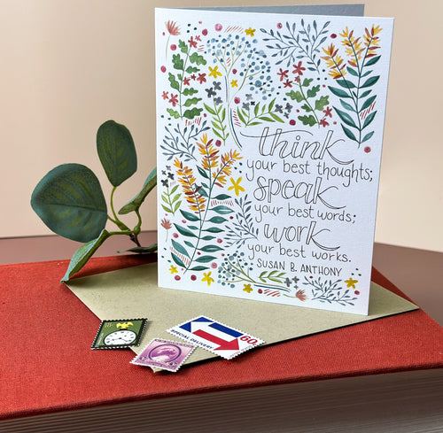 This watercolor card by She Said It is as much a piece of art as the words it depicts! Remind someone to give their best in all they do with these words from suffragist, Susan B. Anthony. She Said It is all about celebrating the words of great women in history. The mother/daughter She Said It team is based in Milwaukee, WI, creating original watercolor artwork and pairing it with motivational quotes.