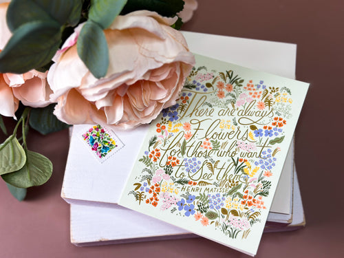 Henri Matisse encoruages us to see the flowers in all circumstances on this beautiful gold foil pressed card from Rifle Paper Company. Rifle Paper Co. was founded in 2009 by husband-wife team Nathan and Anna Bond. Their world is full of bold colors, hand-painted florals, and whimsical characters—and their goal is to create quality products that bring beauty to the everyday.