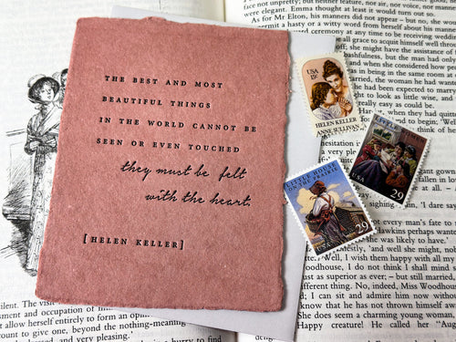 Send or frame this card from Paper Baristas with the reminder that our most precious things are felt in the heart. Write a message on the back of this card for someone dear to you, and the work of art capturing Keller’s words is ready to be hung or framed or tucked away to be re-read on another day. The crisp letterpress of the words and the softness of the paper make this card a true work of art. Paper Baristas love textures, letterpressing, sustainability, coffee and people. Each paper is made from upcycled cotton rags that were going to be tossed out by the garment industry, and Paper Baristas is also actively fighting to end human trafficking around the world with every purchase of a Paper Baristas card.