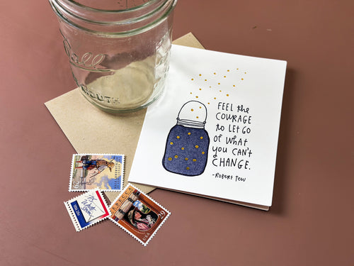 This gold foil, letterpressed card featuring fireflies escaping a mason jar reminds us that it takes courage to let go of the things we cannot change with words from author Robert Tew. We love the deep navy mason jar and twinkling gold foil fireflies from this Big Wheel Press creation. Big Wheel Press was founded by Bill Muller in 2006. Its name comes from the first press Bill owned - a Pearl #14 with a large cast iron flywheel. Big Wheel Press continues to use traditional letterpress techniques to craft quirky cards with a vintage flair.