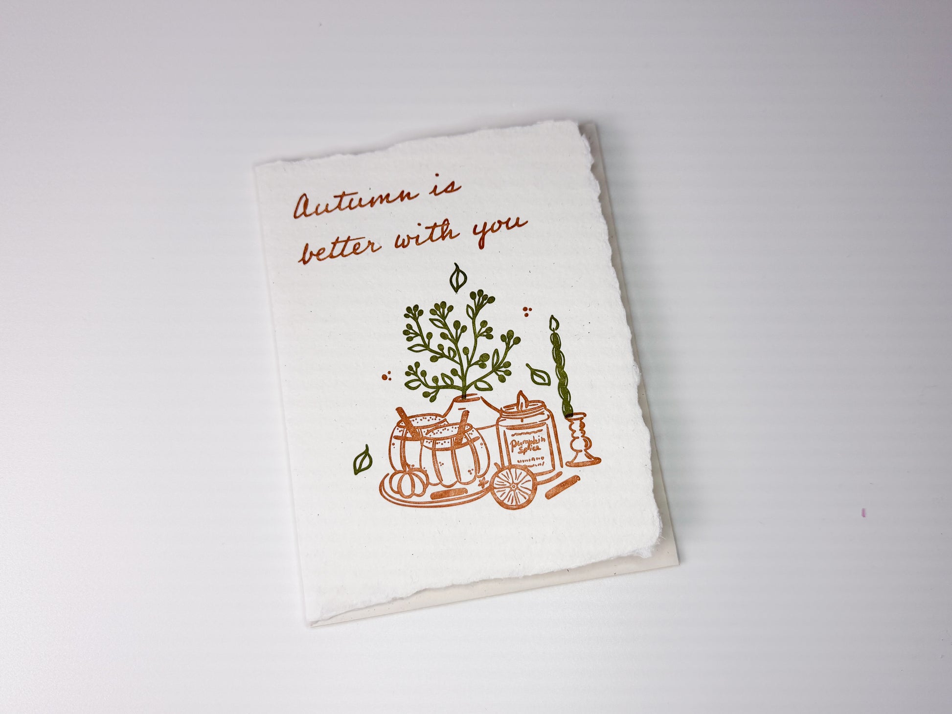 Wish someone a Happy Autumn with this gorgeous letterpress fall scene from Paper Baristas.