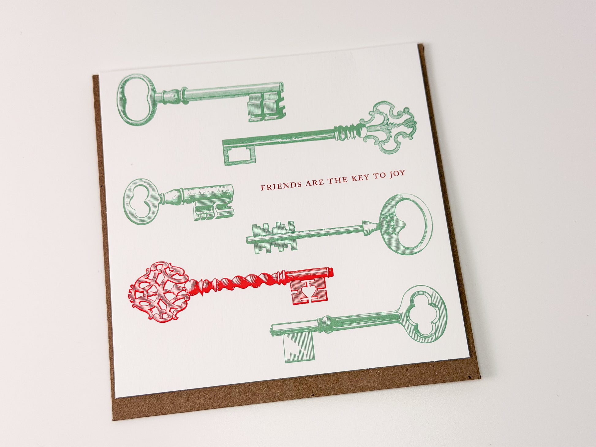 Celebrate the ones who unlock the best parts of life. This heartfelt card from &M Studio features an array of beautifully illustrated skeleton keys in all shapes and sizes on the front, paired with the warm sentiment “Friends are the key to joy.” On the back, a sweet surprise—a delicate heart-shaped lock, a quiet reminder of the connection that ties it all together. Perfect for besties, soulmates, or anyone who holds a special place in your heart.