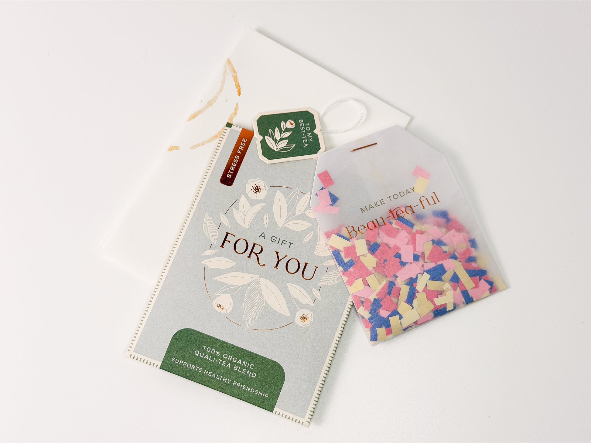 Delight someone you love with this one-of-a-kind greeting card from the thoughtful minds at UWP Luxe. Every detail has been steeped in charm—from the exterior envelope splashed with playful tea rings and splatters, to the interior tea sachet designed with space for your personal message. Inside, a whimsical surprise awaits: a confetti-filled tea bag adorned with shimmering gold foil that reads, “Make Today Beau-tea-ful.” It’s not just a card—it’s a tiny celebration in an envelope, guaranteed to brighten anyone’s day.