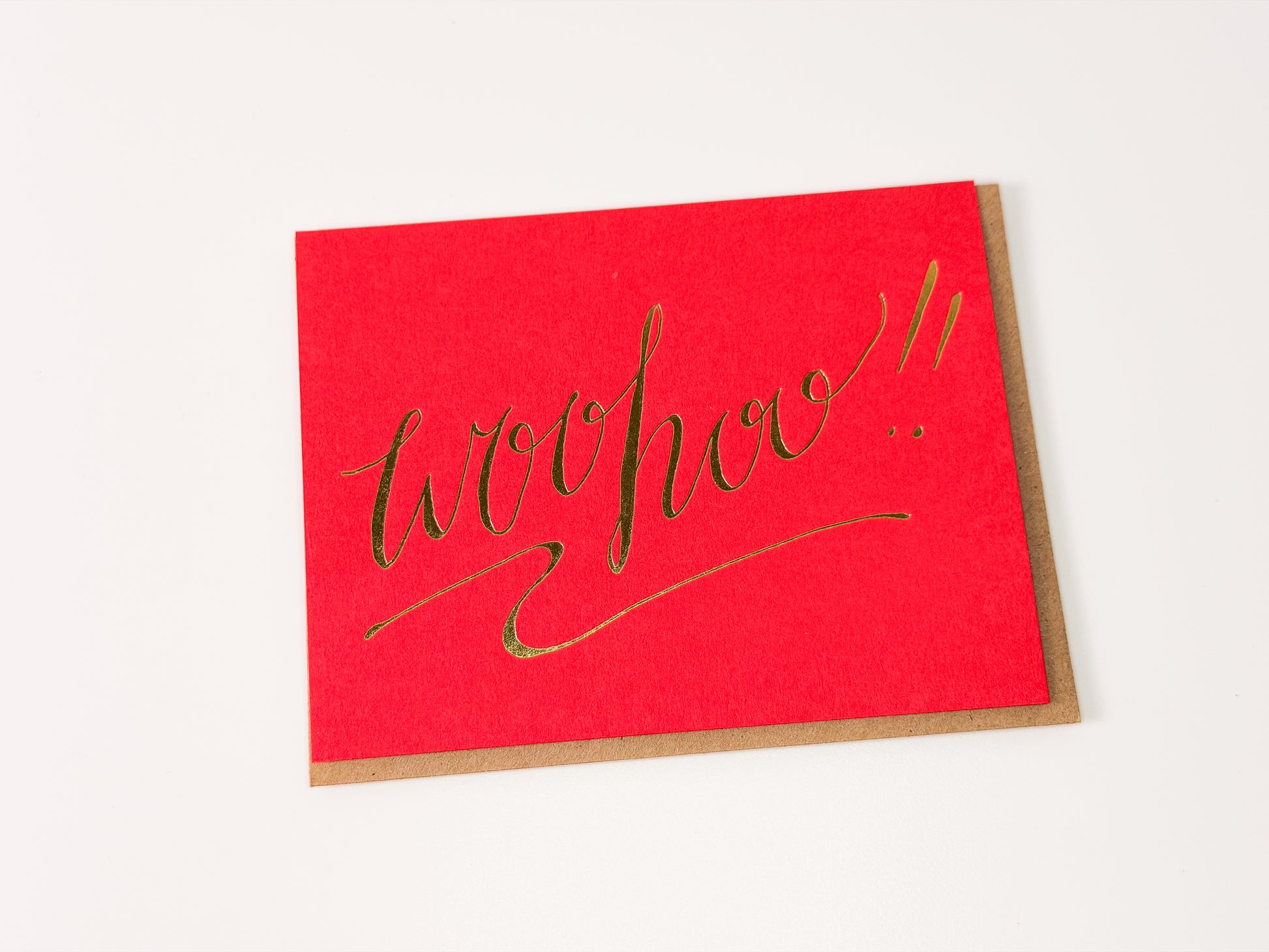 Send a big "Woohoo!!" to celebrate your next joy with this bright red card in gold foil press.