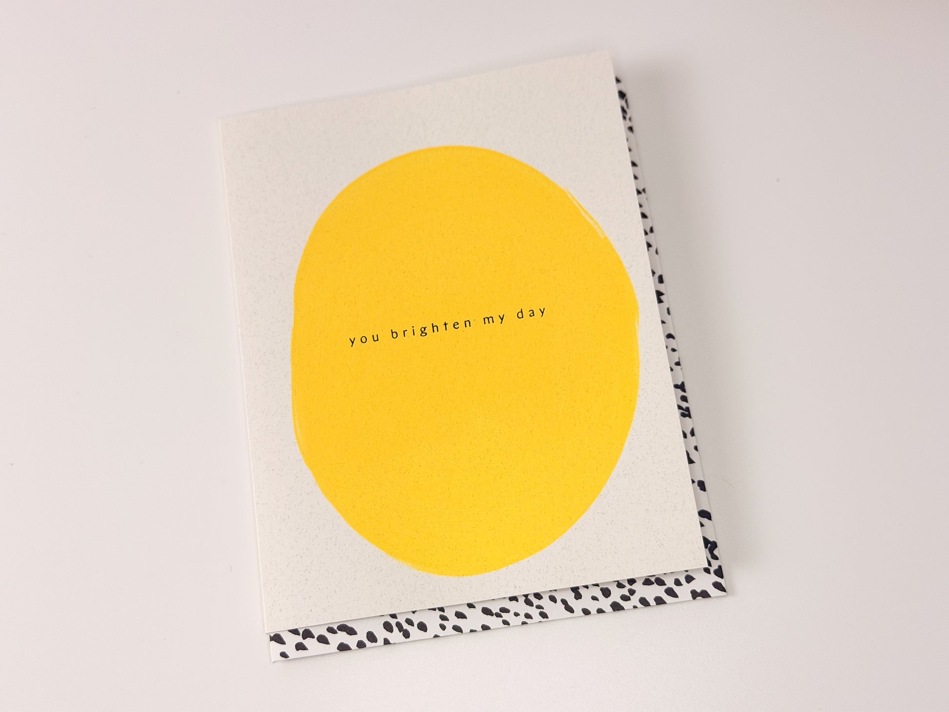 Bold, simple, and full of heart—this card features a hand-painted, abstract yellow oval with the uplifting message “You brighten my day” at its center. Paired with a striking black and white splotched envelope, it’s the perfect blend of playful and sophisticated. A sunny little note for anyone who brings light into your world.